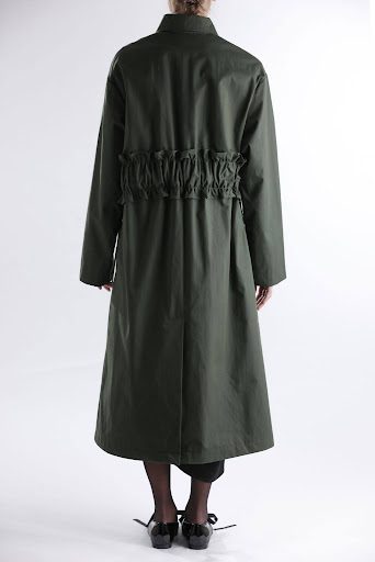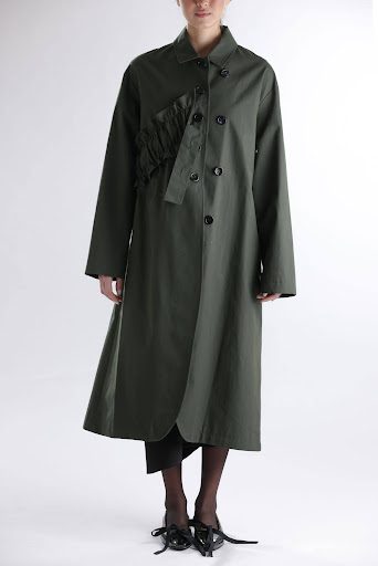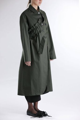 Long trench coat with a classic collar, adjustable belts that can be attached at different points on the bodice to create various fits and shapes, or worn loose for a relaxed fit.